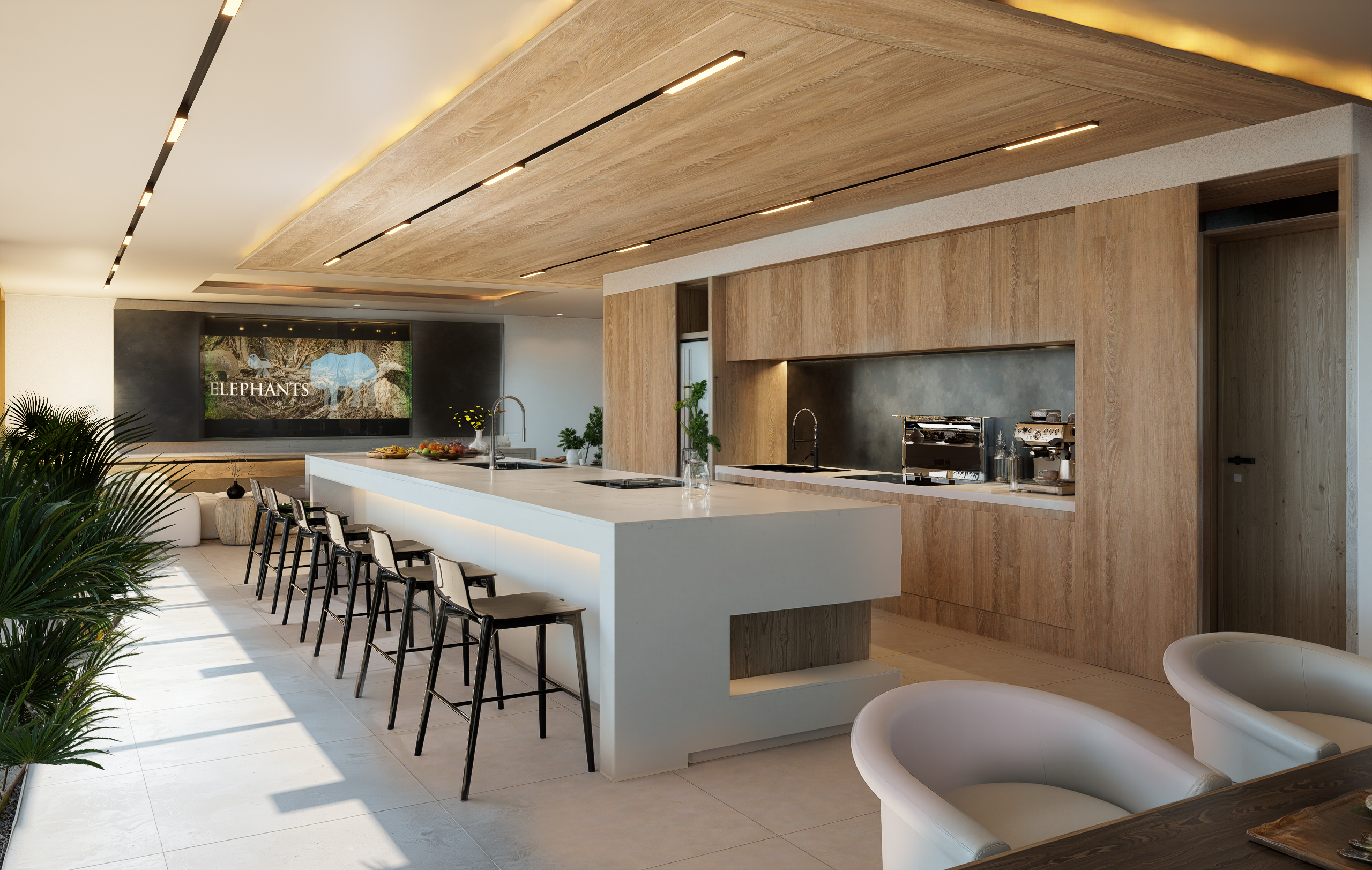 In the luxurious villa’s kitchen, culinary artistry is elevated to new heights by the pool and hill views that graces every culinary moment.