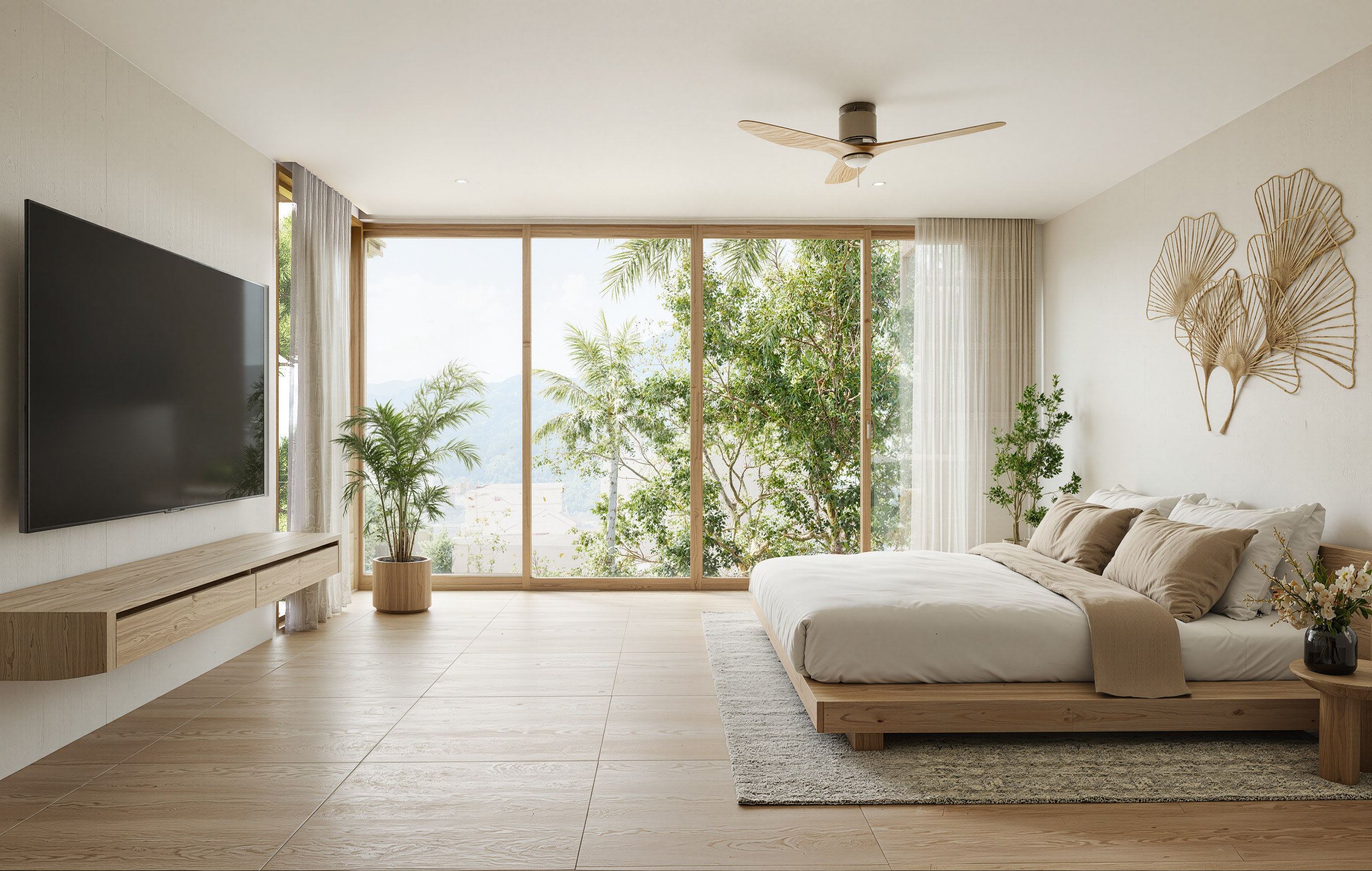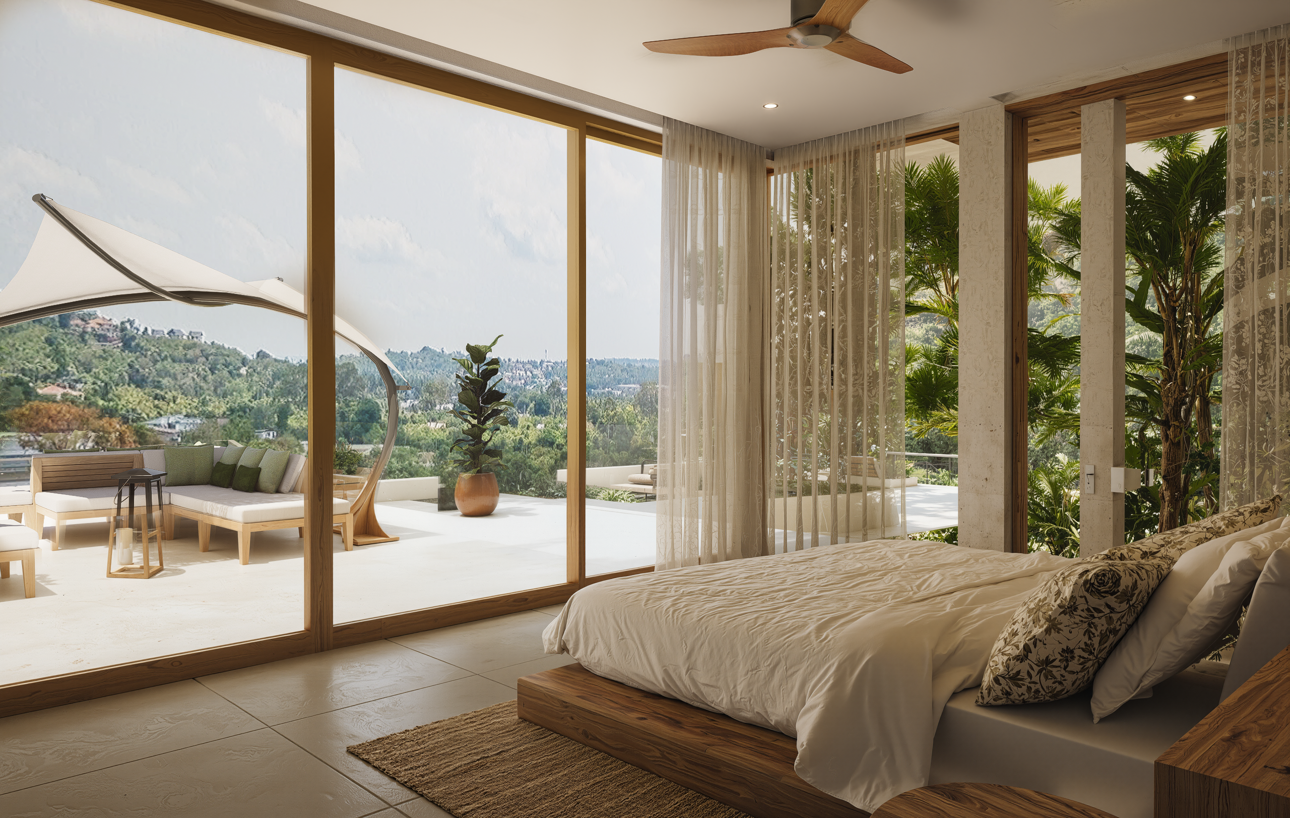 The living space embody both style and comfort, featuring custom designer sofas, a blend of linen and Cotton Ferm along a custom made base table. Your gaze is drawn to the wooden décor and antique items from Southeast Asia that adorns the walls and furnishings All elements meticulously crafted to exemplify elegance and comfort. Decorative handcrafted potteries by a popular clay maker in northern Thailand bring an extra touch of elegance to the villa.