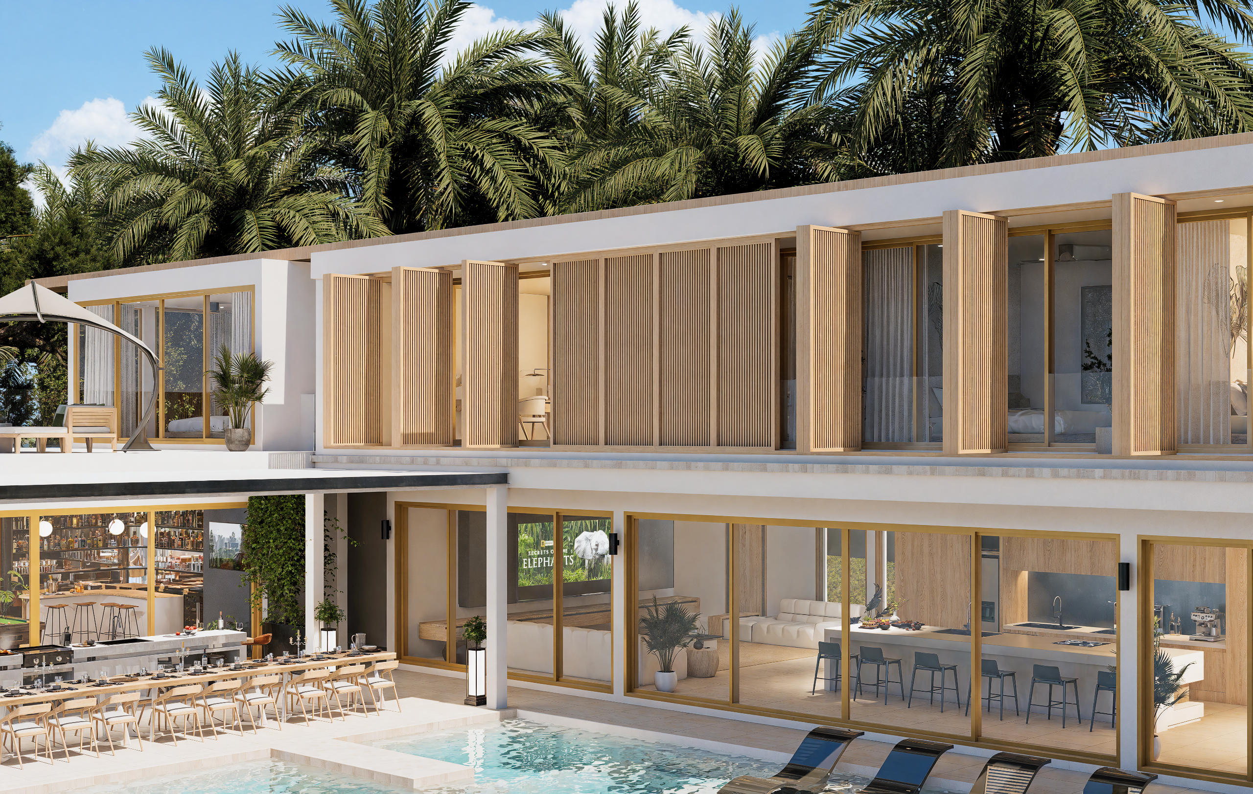The enchanting sight of Samui Heaven elephant sanctuary visible from this living space adds a touch of magic and wonder, offering a serene and picturesque backdrop to your outdoor oasis.