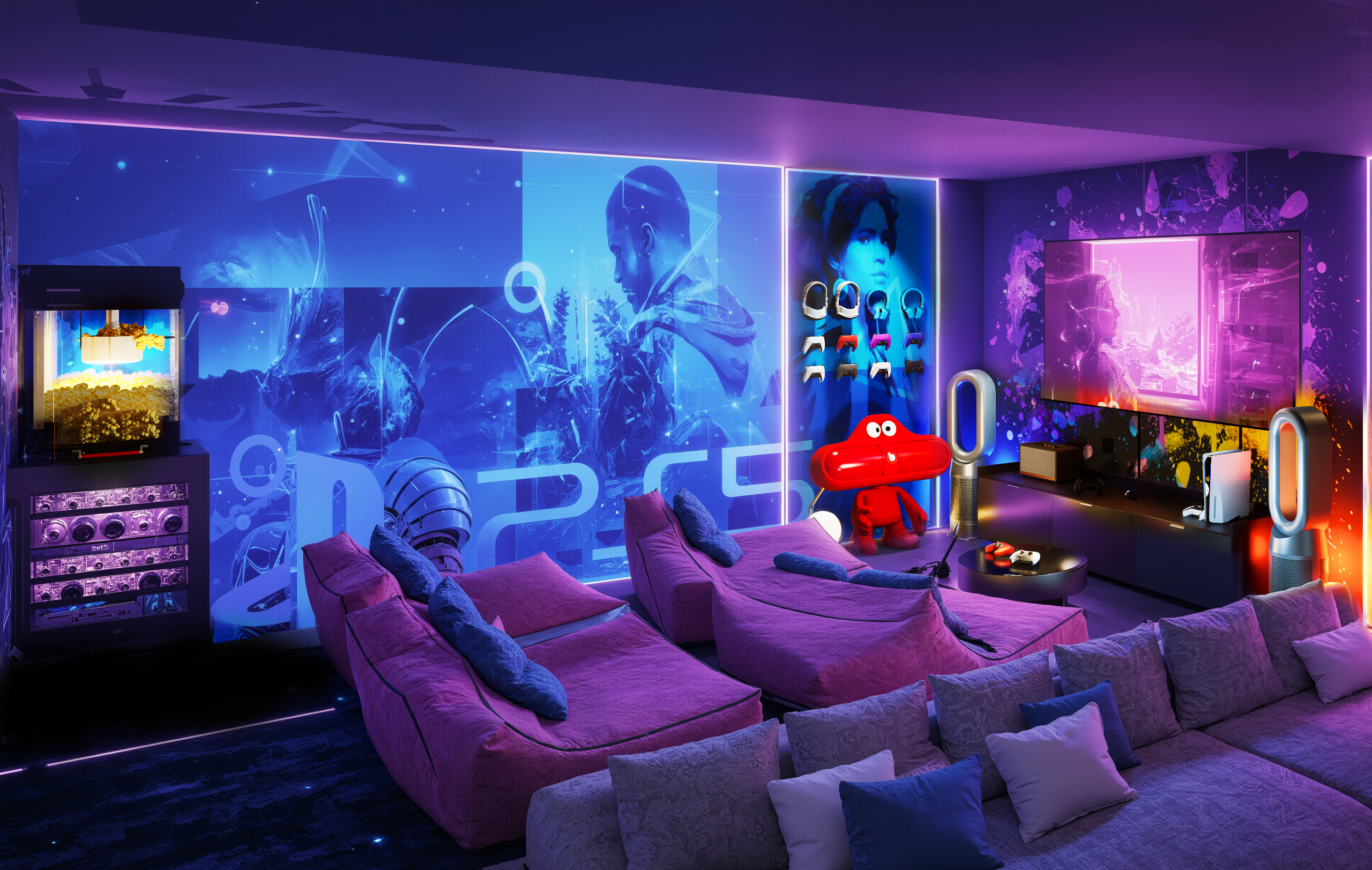Nestled in the private cinema room, this snug gaming nook features plush seating, and a sleek console setup—perfect for laid-back play and late-night fun.